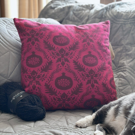 The festival theme for this year was the Coronation of Persephone, Queen of The Underworld. Taking inspiration from the High Priestess tarot card, Persephone herself, pomegranates, seasonal change, and the duality of two worlds, I created a curated collection of products with my new fabric design as its heart. Just as Persephone was a ruler between two realms, each of these products serves two or more purposes.
