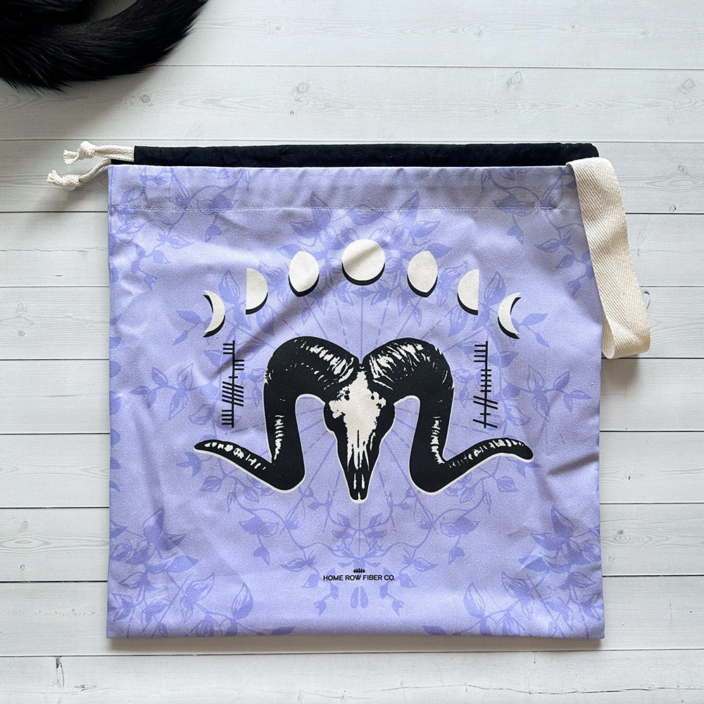 The perfect utilitarian project bag for Knit Witches and Wool Wizards – Made from natural, Mother Earth-friendly fabrics that I’ve designed myself. No saggy interior pockets or unnecessary extras, just a beautifully made bag for you and the magic you craft. Look for an uplifting affirmation, written by me, on the top inside binding.