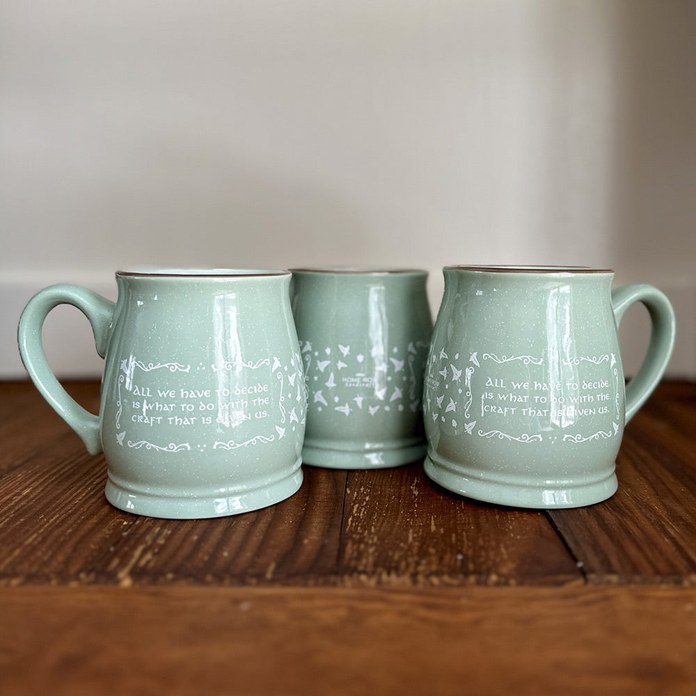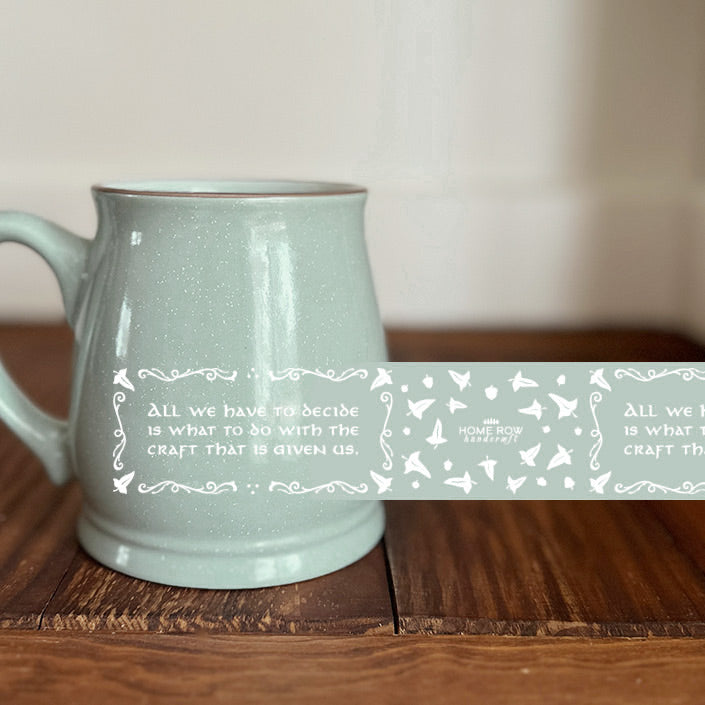 This 15oz. cottage-style ceramic mug celebrates a reworking of my all-time favorite Tolkien quote, spoken by the wise wizard himself -- "All we have to decide is what to do with the craft that is given us." The decorative artwork wraps fully around the mug and features hand-drawn scroll work, acorns, and familiar elvish leaves.