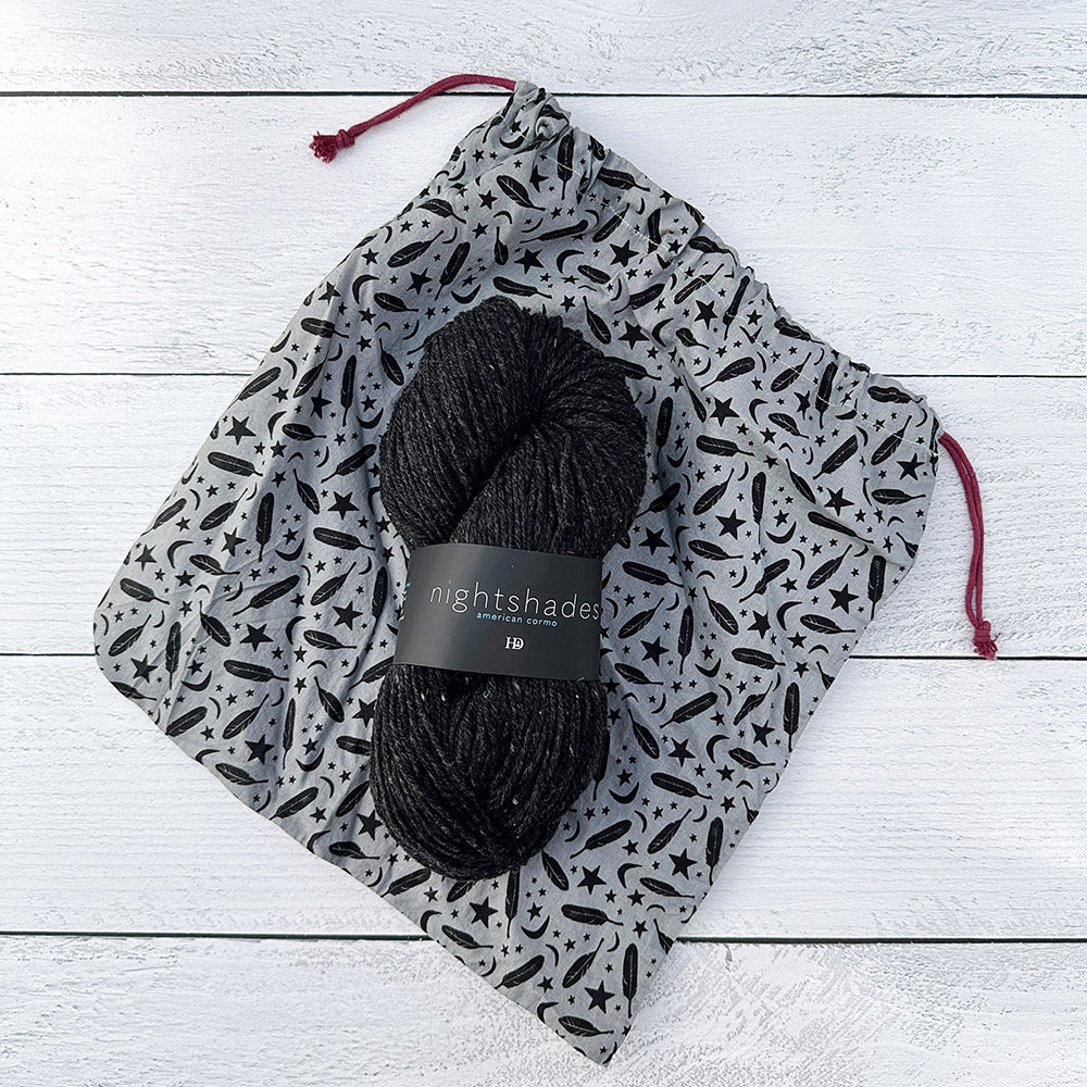 The same lightweight project bag you love, but hand-dyed in grey and pomegranate red especially for the Fiber Witch Festival 2025! Also makes a beautiful reusable gift bag, or a storage bag for hand-knits and other delicates.