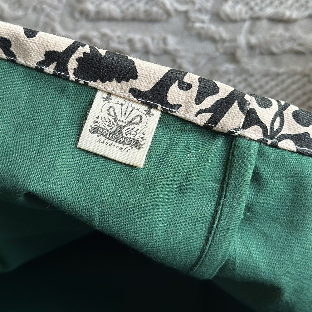 Handcrafted from heavy duty organic cotton canvas, custom dyed in a soft pale peach hue and screen printed by hand with black ink. Fully lined with lightweight forest green cotton. Fabric designed by Rochelle New of Home Row, printed in India.