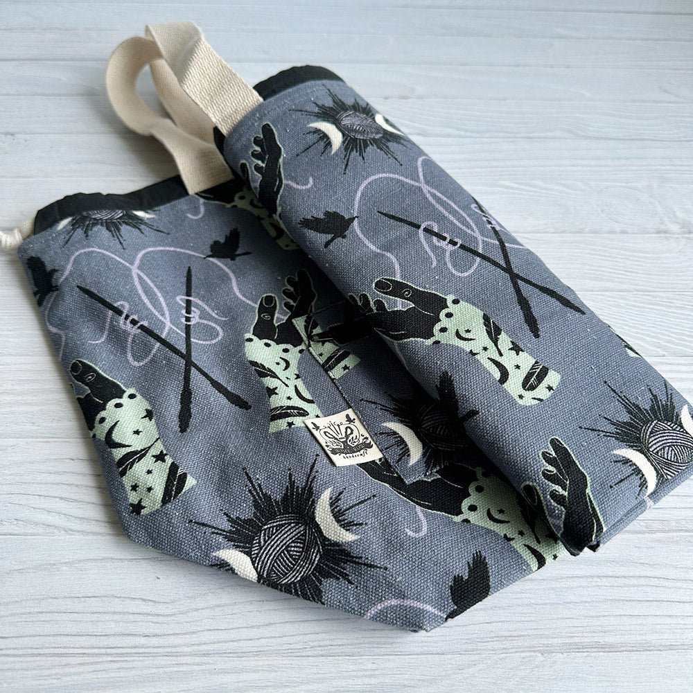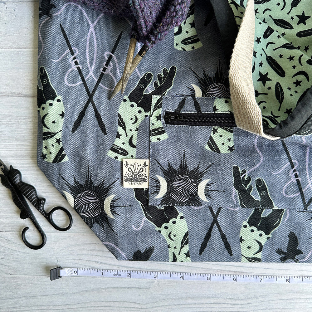 Sizing: 16.5″ wide at the top, 10.5″ tall, 10.5″ wide at the bottom with a 6″ boxed corner, 12″ carrying handles. Double drawstring. And! An exterior zipper pocket for knitting notions measuring 4" tall by 8" wide.