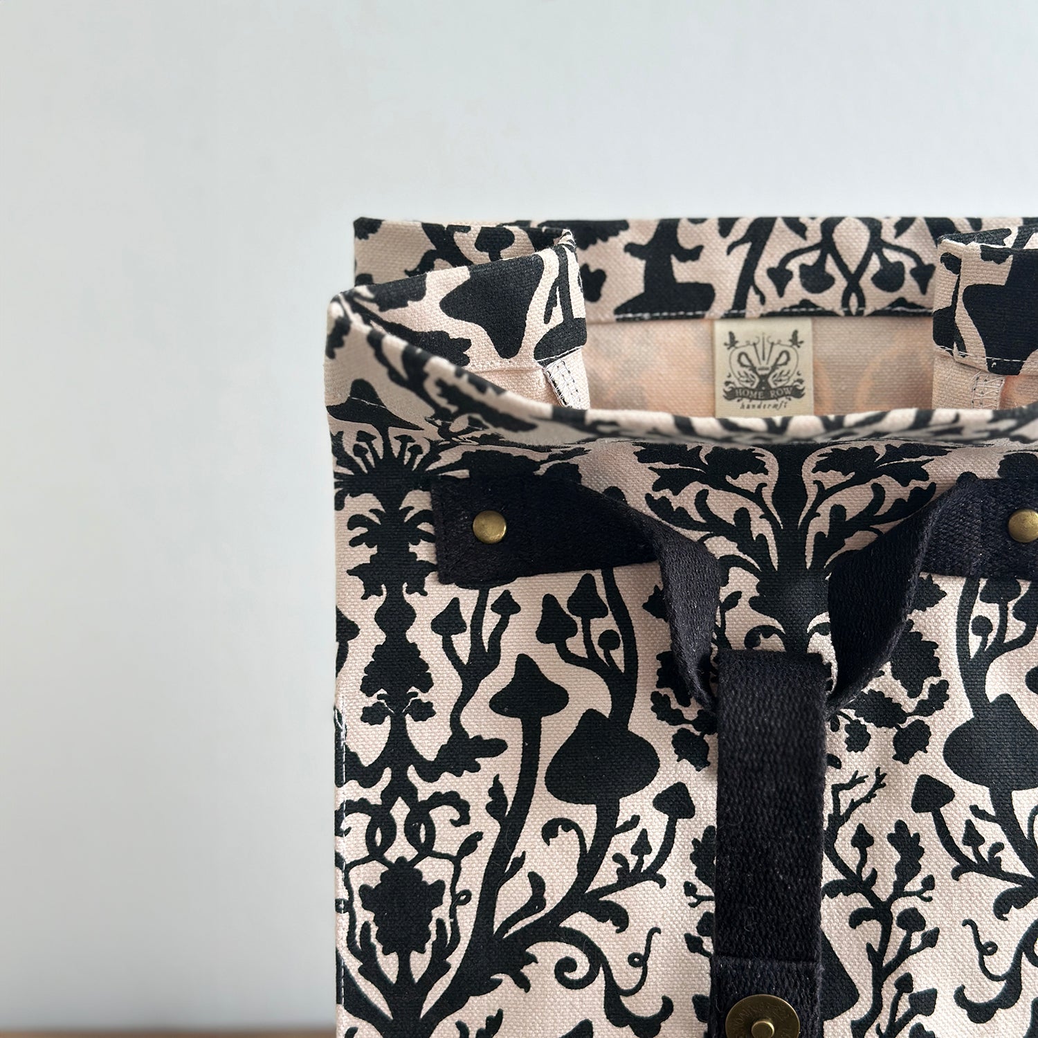 Materials: Heavyweight 22oz organic cotton canvas in a pale peach color with black twill tape and metal hardware with an antique brass finish. Cotton Home Row Handcraft logo tag inside. Unlined but with professionally finished seams. Fabric design by Ro of Home Row and screen-printed by artisans in India.