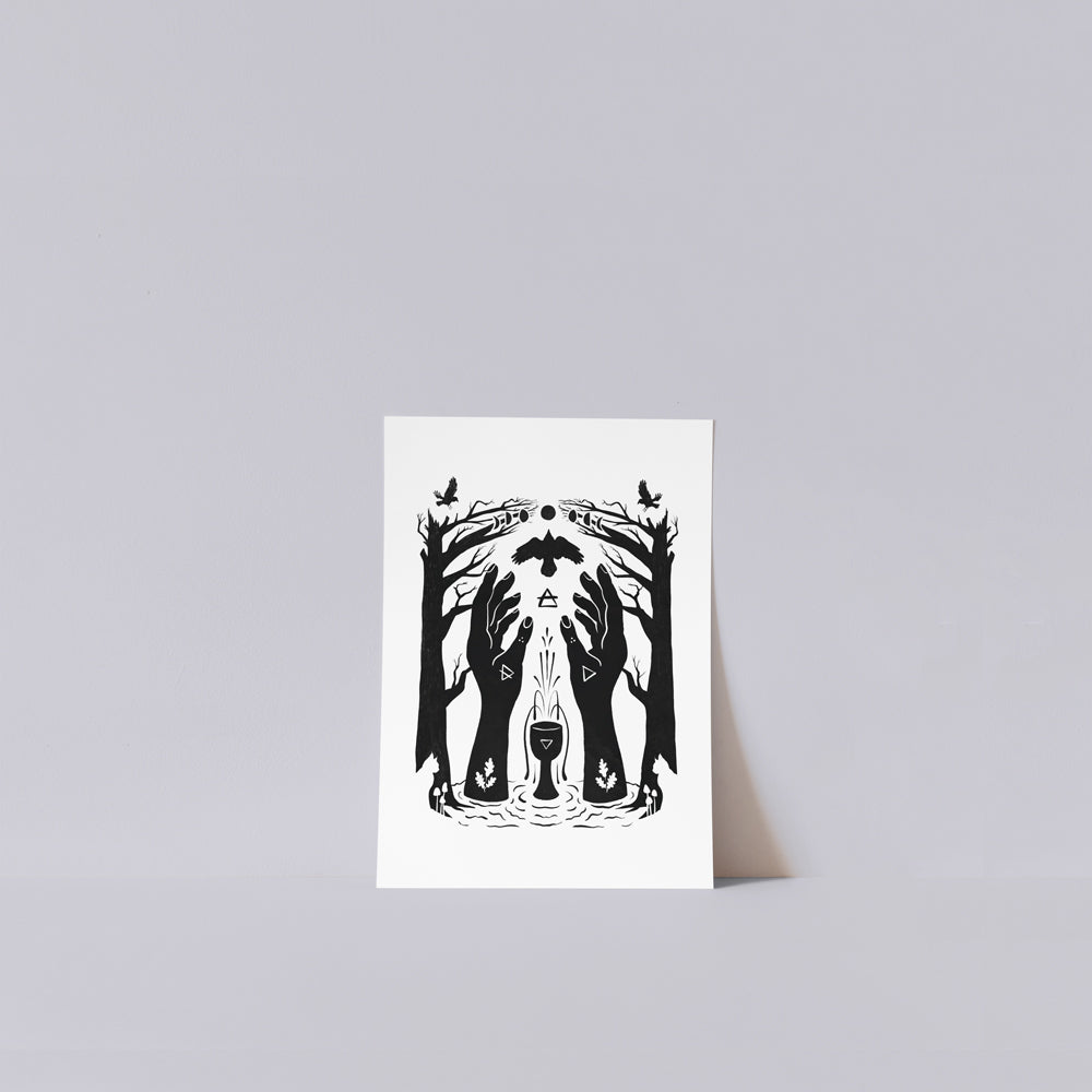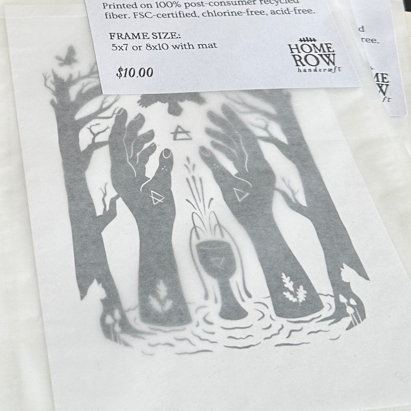 Printed on uncoated heavy coverstock paper that's FSC-certified, chlorine-free, acid-free, and made from 100% post-consumer recycled fiber. Black ink on white paper with natural flecks.